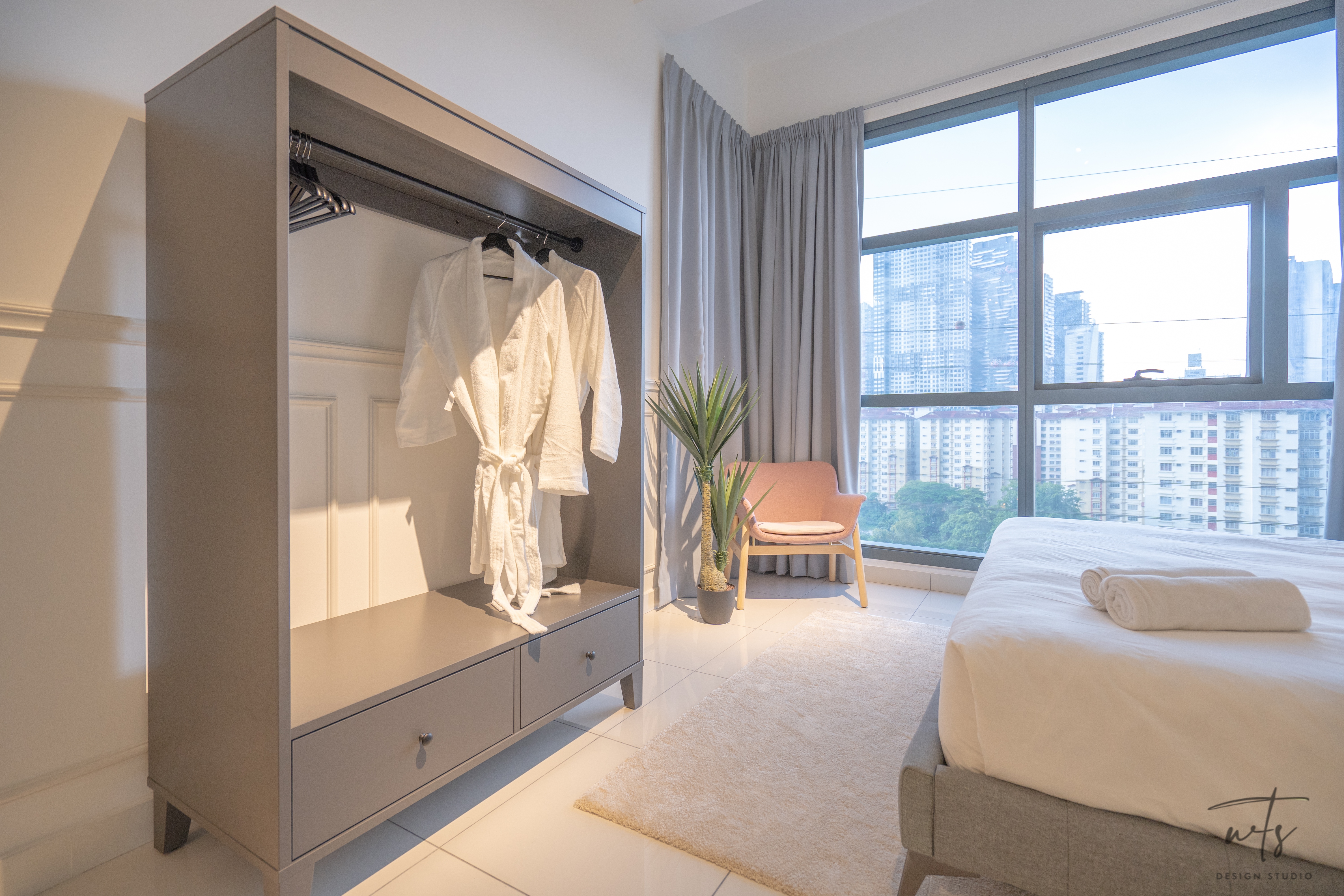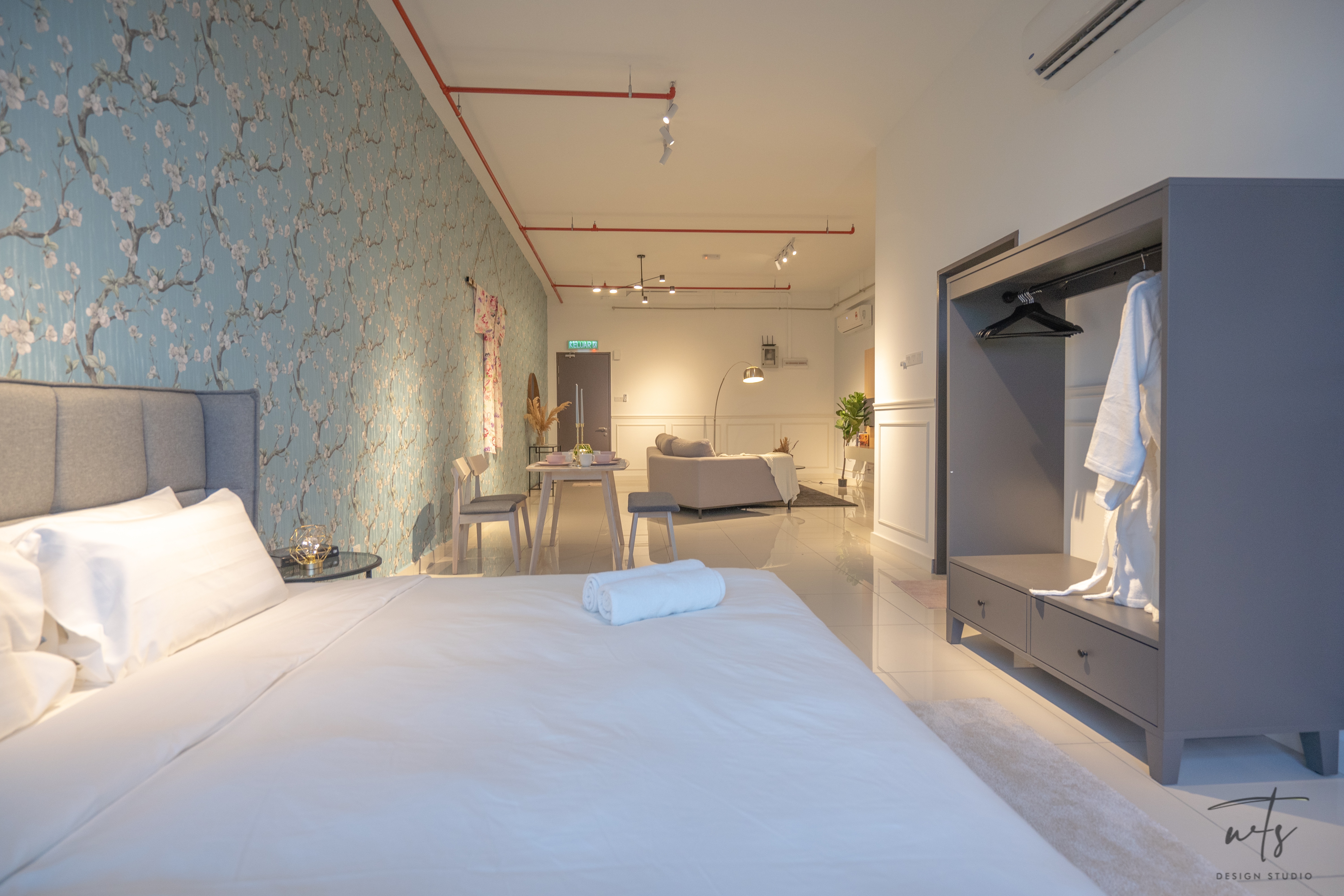 This 1,000 sq.ft. studio apartment was designed for hospitality use, blending contemporary minimalism with a subtle Japanese influence. The aim was to create a serene, guest-friendly environment that balances comfort, functionality, and cultural character.