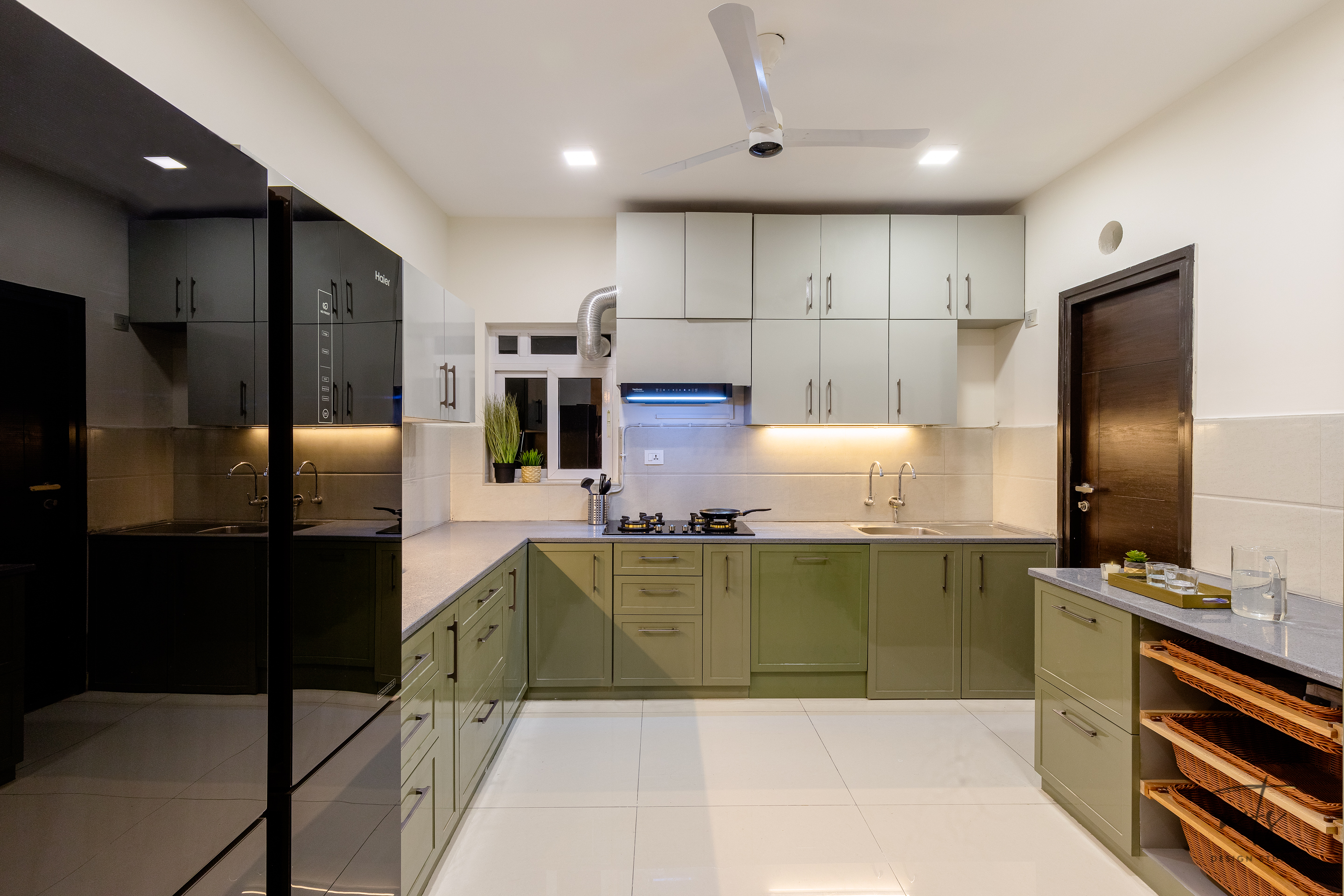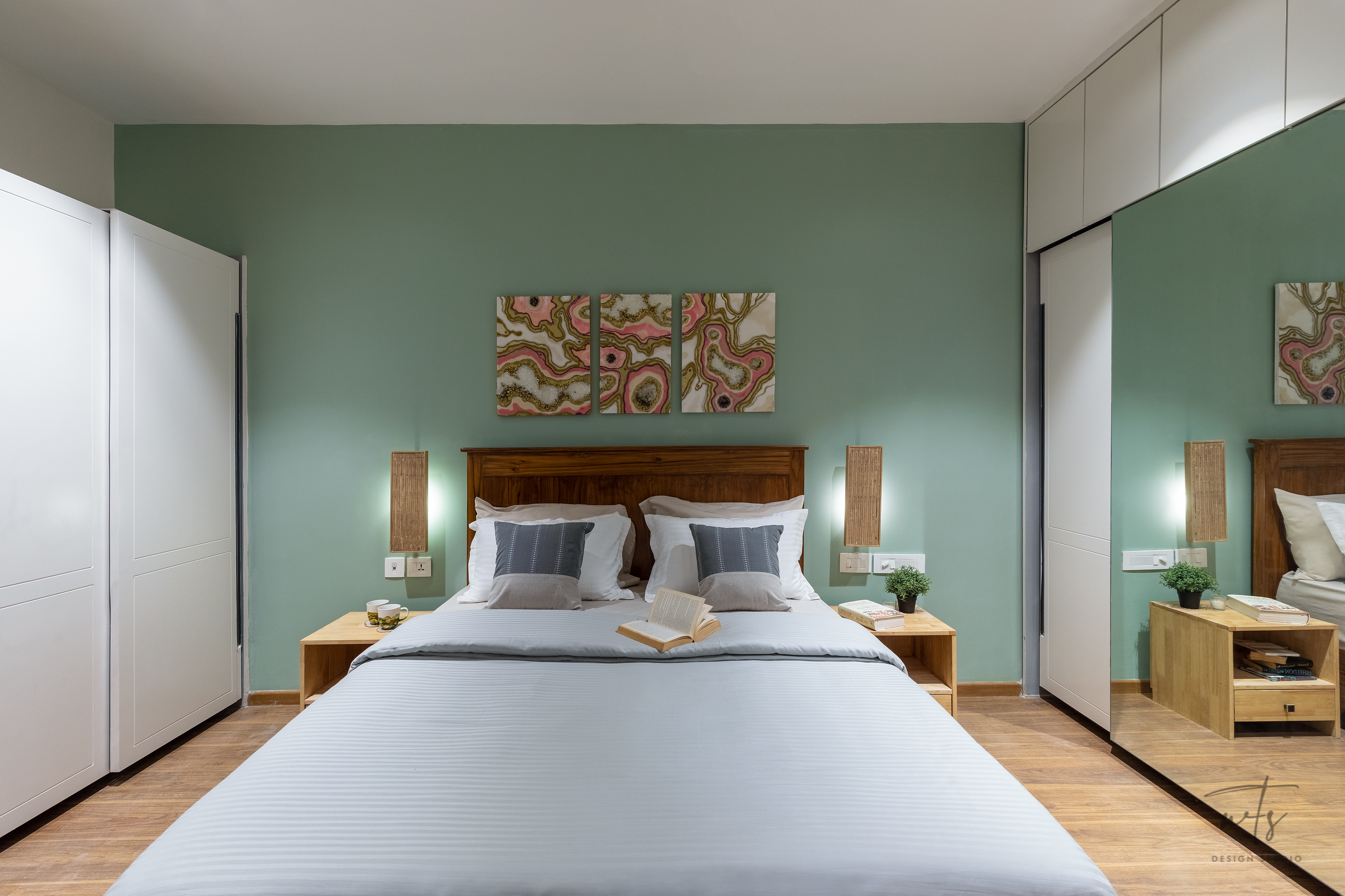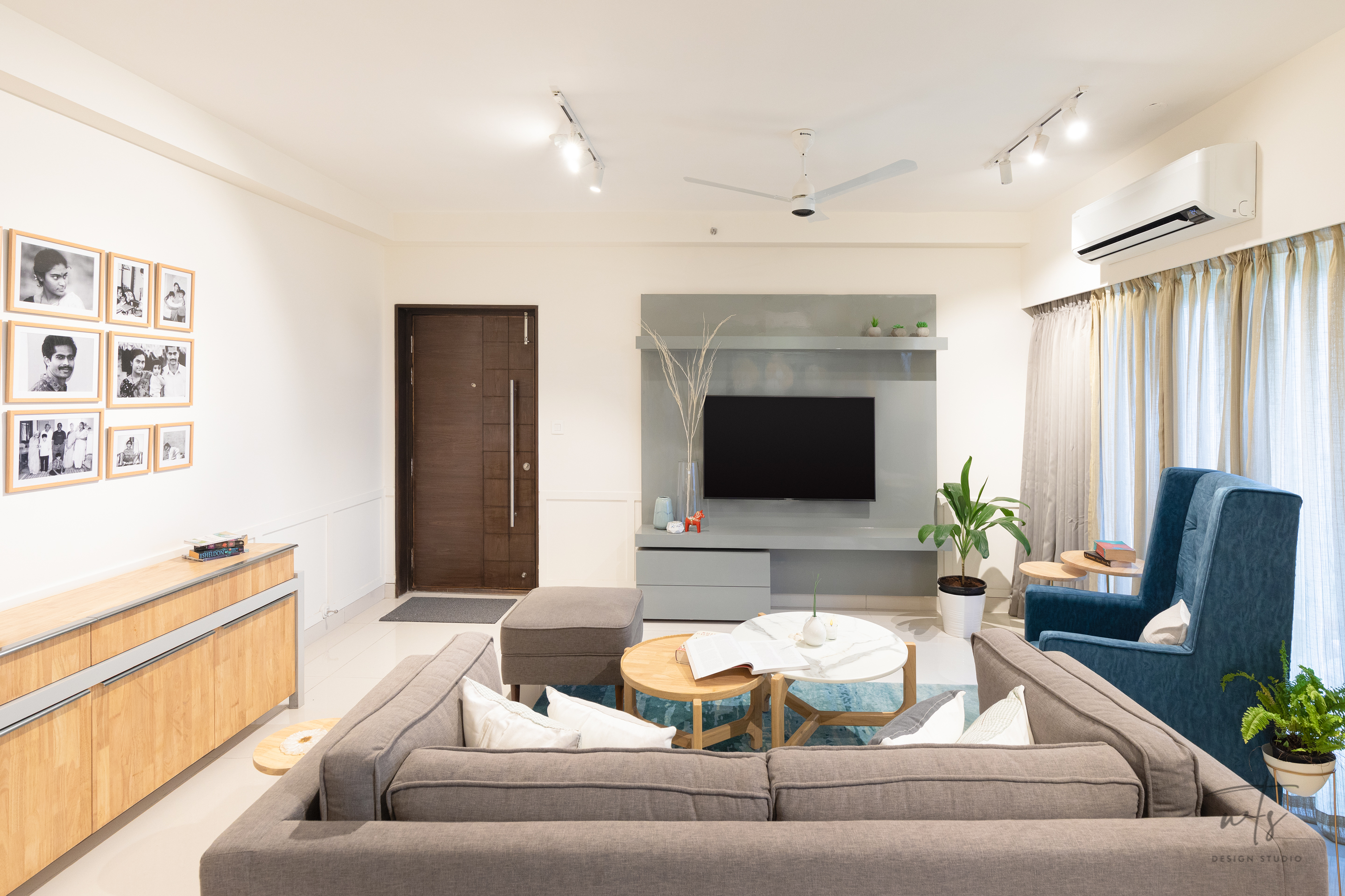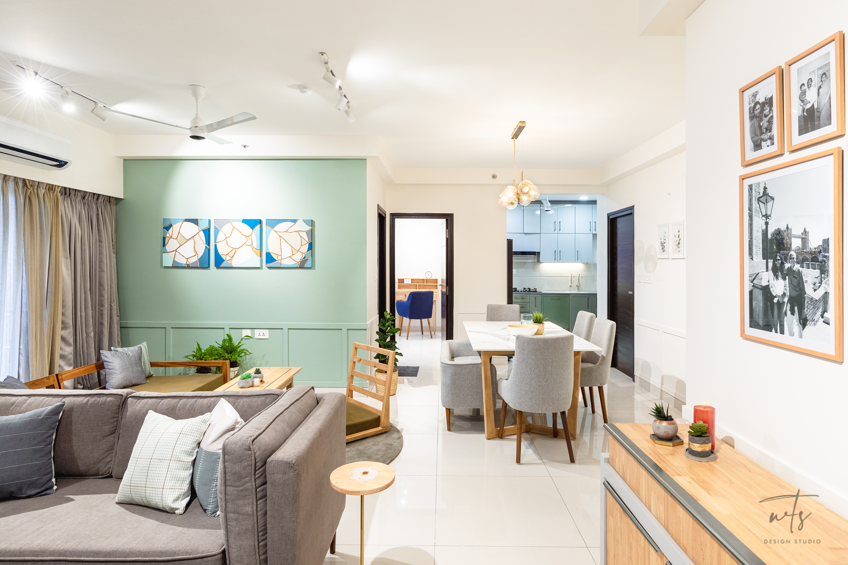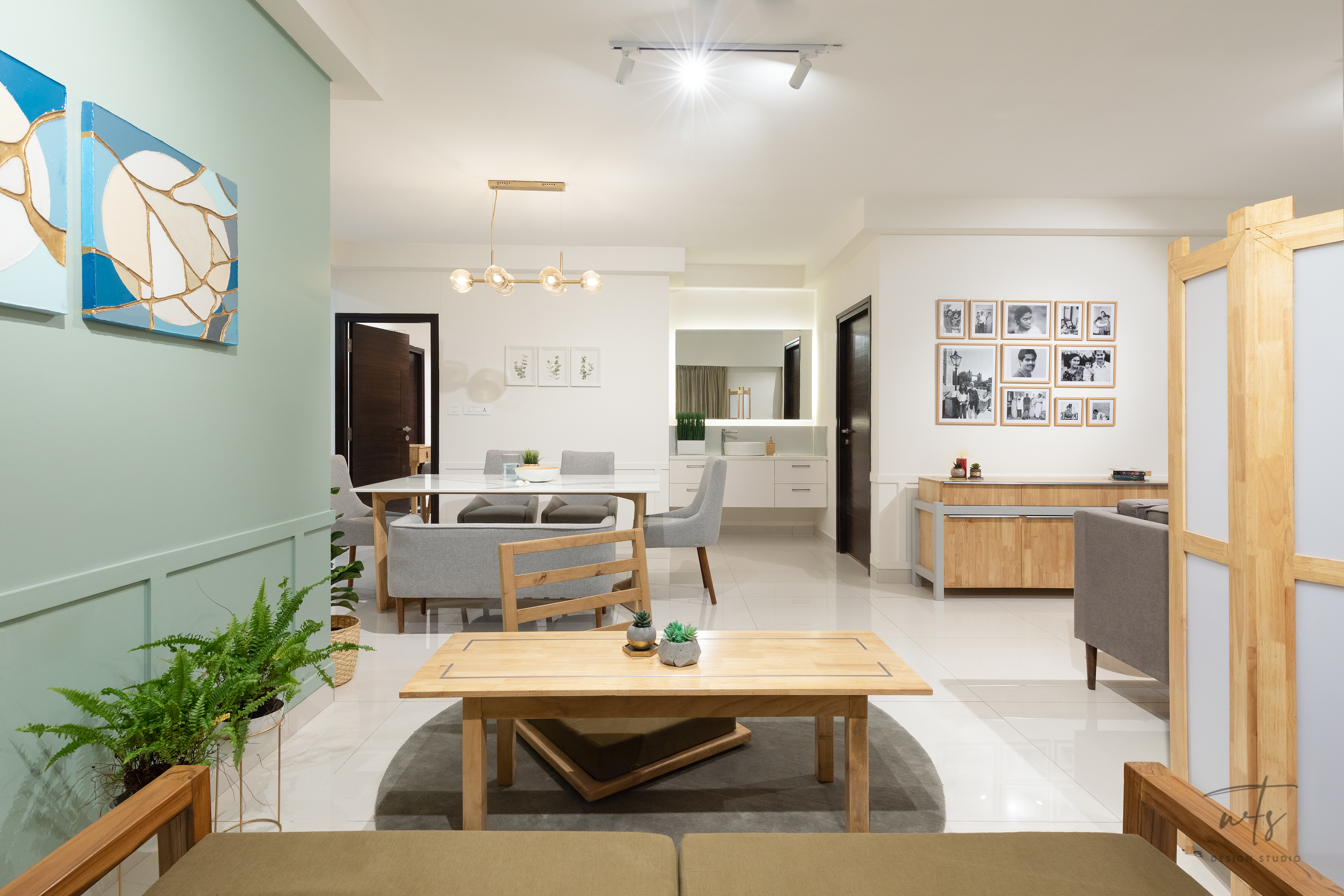 TThe living space embraces an open-plan layout, where natural oak furniture and sage accent walls create a soothing backdrop. A mix of upholstered seating in neutral greys and teal tones is anchored by a textured rug, bringing balance between comfort and style. A sleek TV wall and layered artworks make the living area versatile - equally suited for relaxation and hosting.