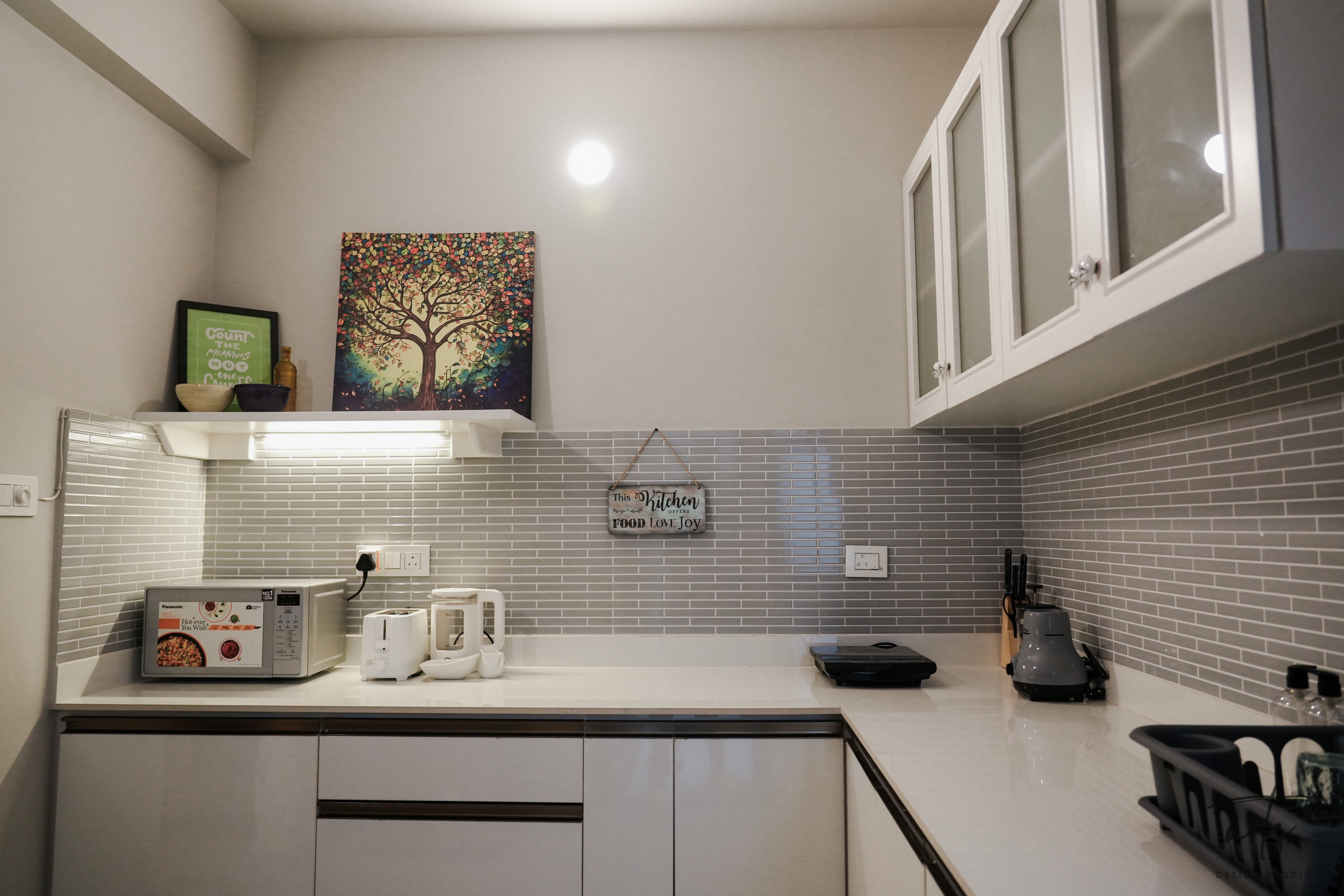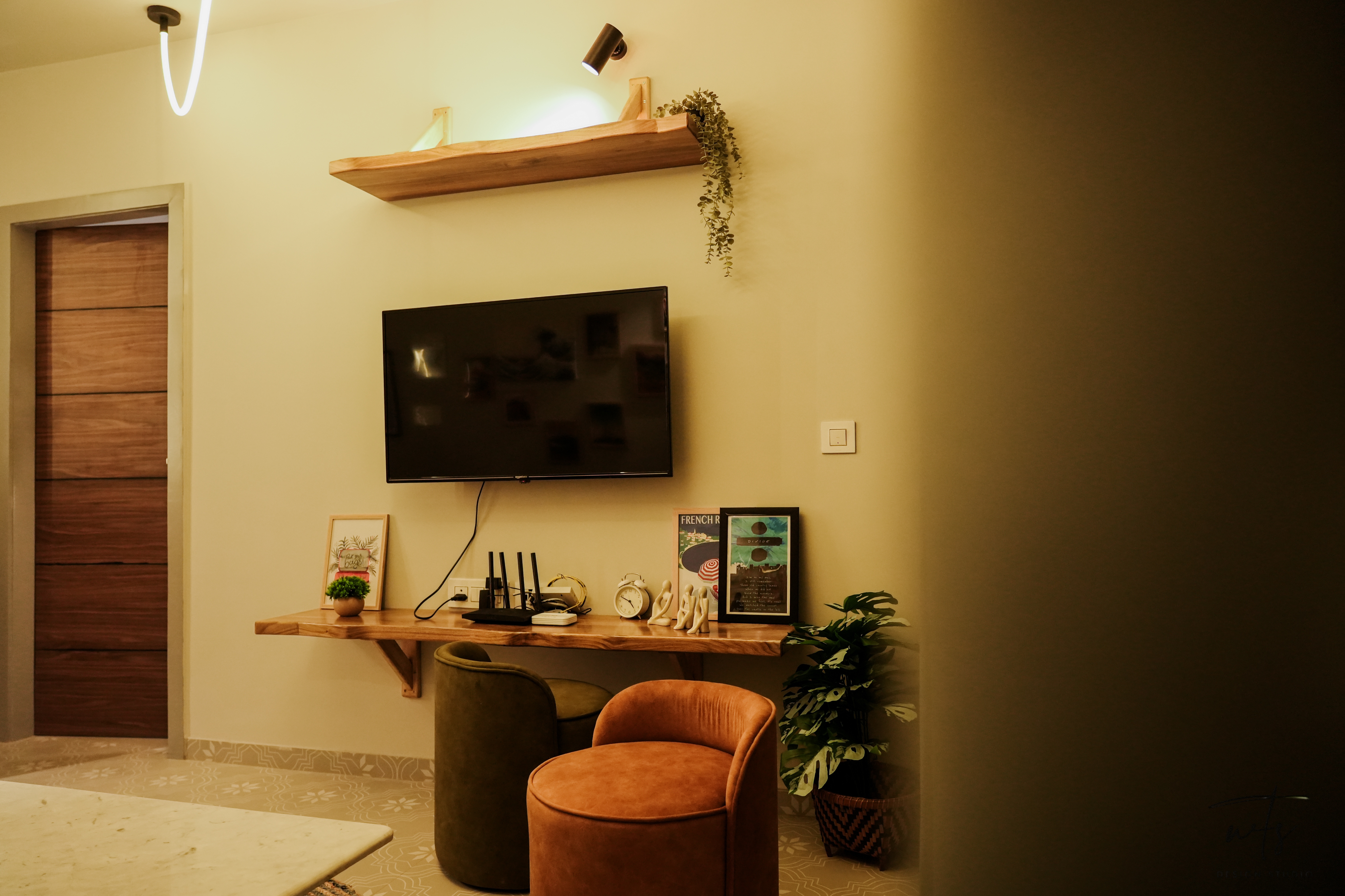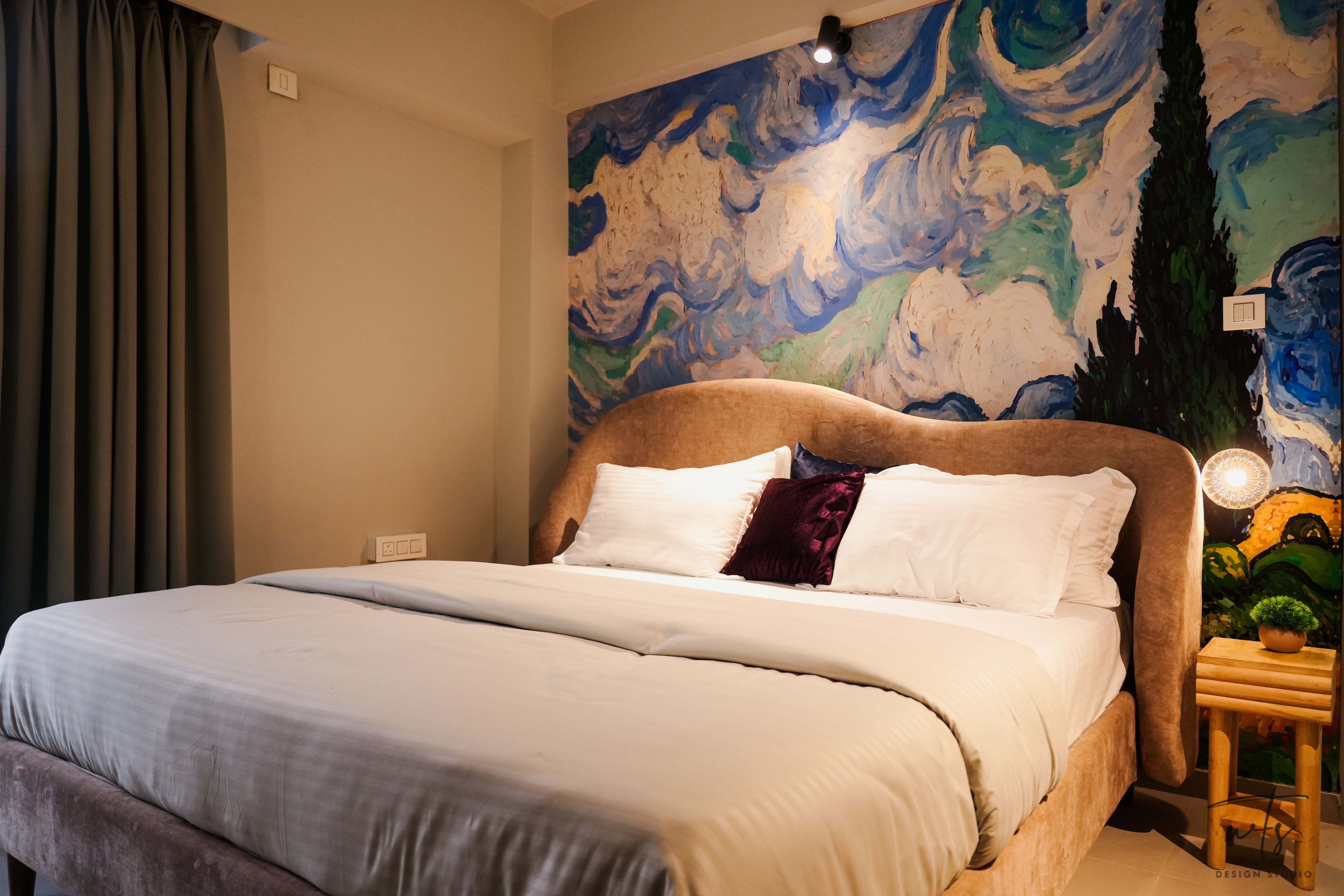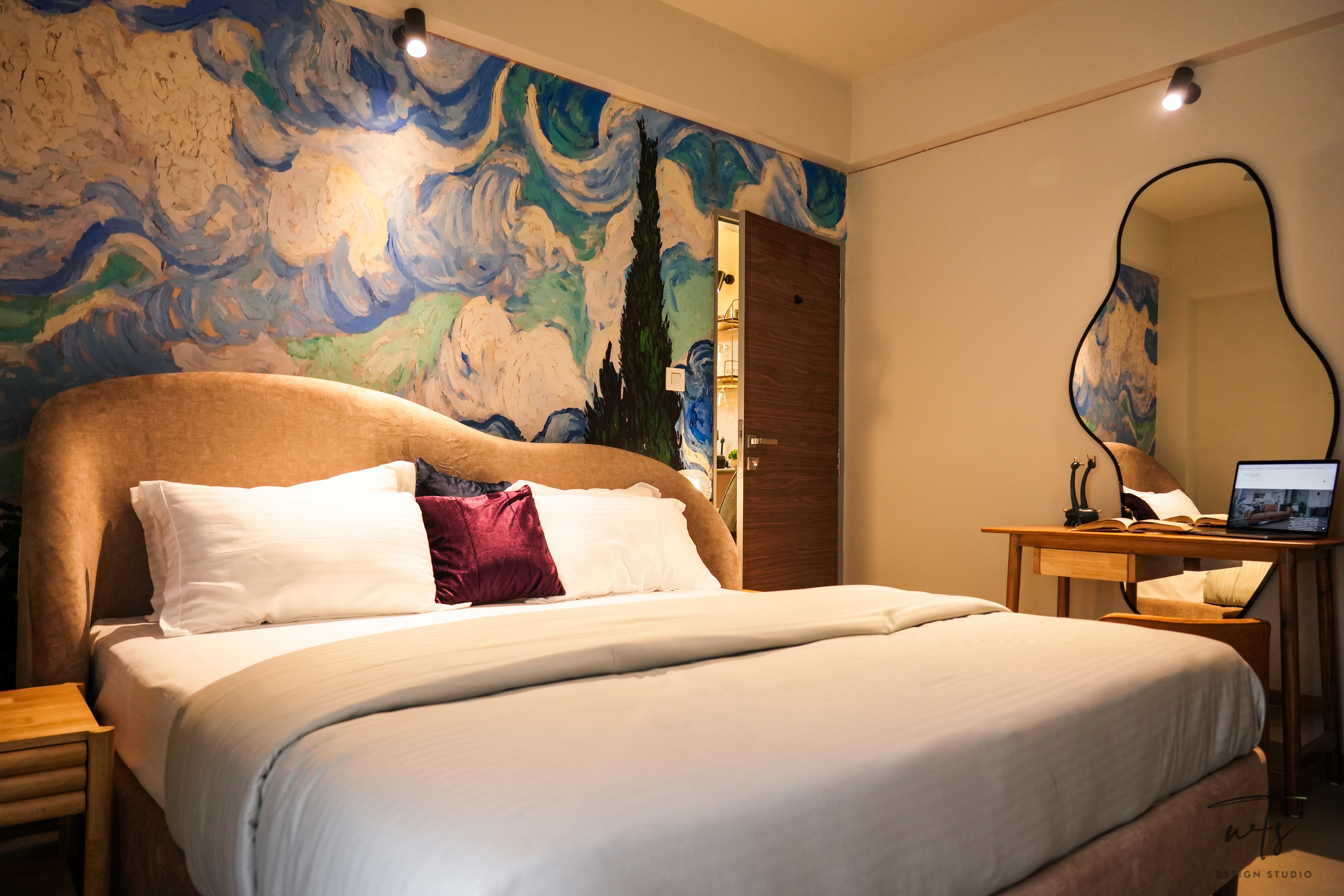 The apartment is a collage of visual experiences - not loud, but emotionally rich. A custom wallpaper ceiling brings the spirit of Van Gogh's brushwork overhead, while decor frames and abstract mirrors animate the walls with layered artwork and reflections. Rope lighting installations wind through the ceiling in soft organic patterns, adding a sculptural glow that feels both whimsical and warm.