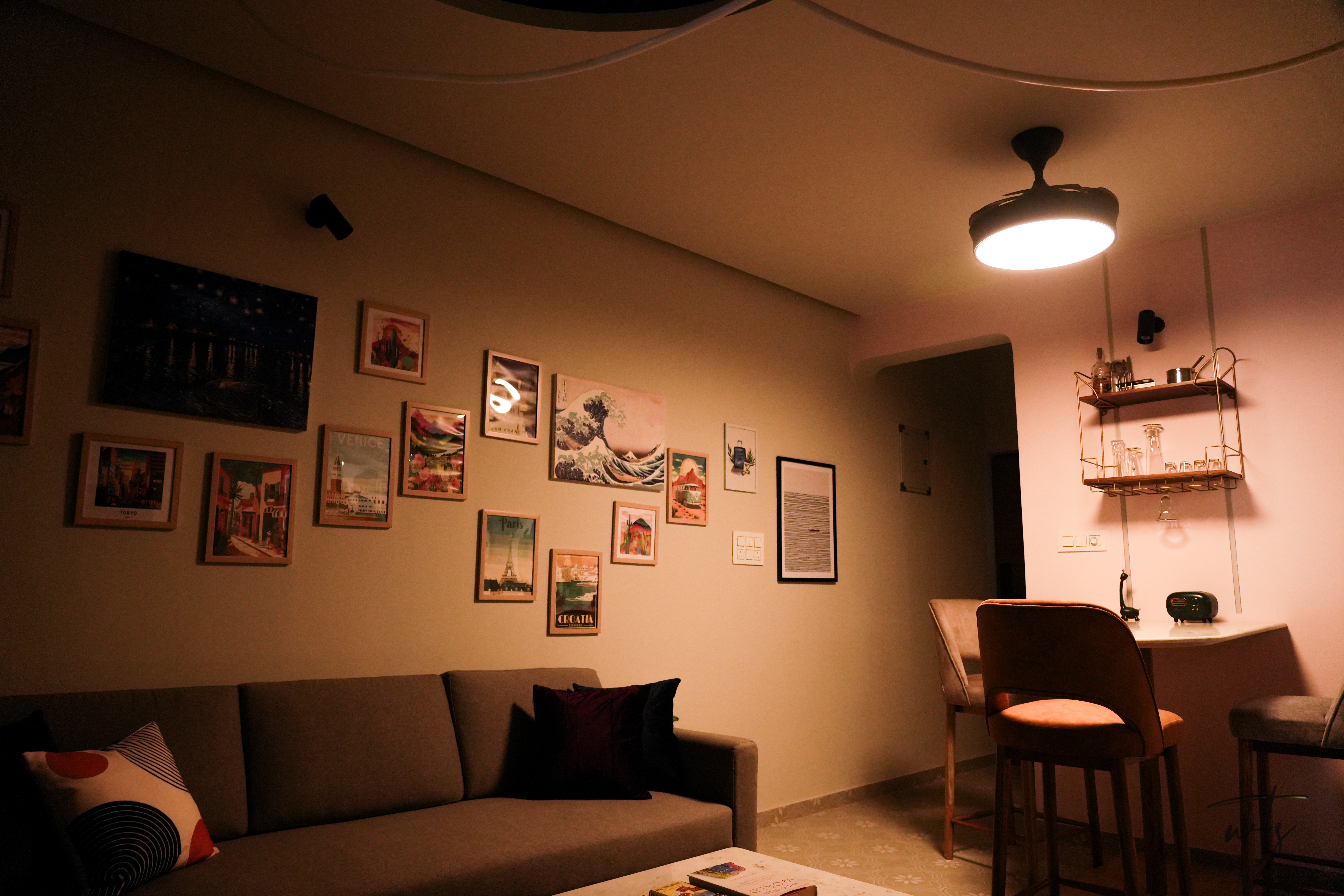 A curated gallery of art frames and custom prints turns the living area into a walk-through