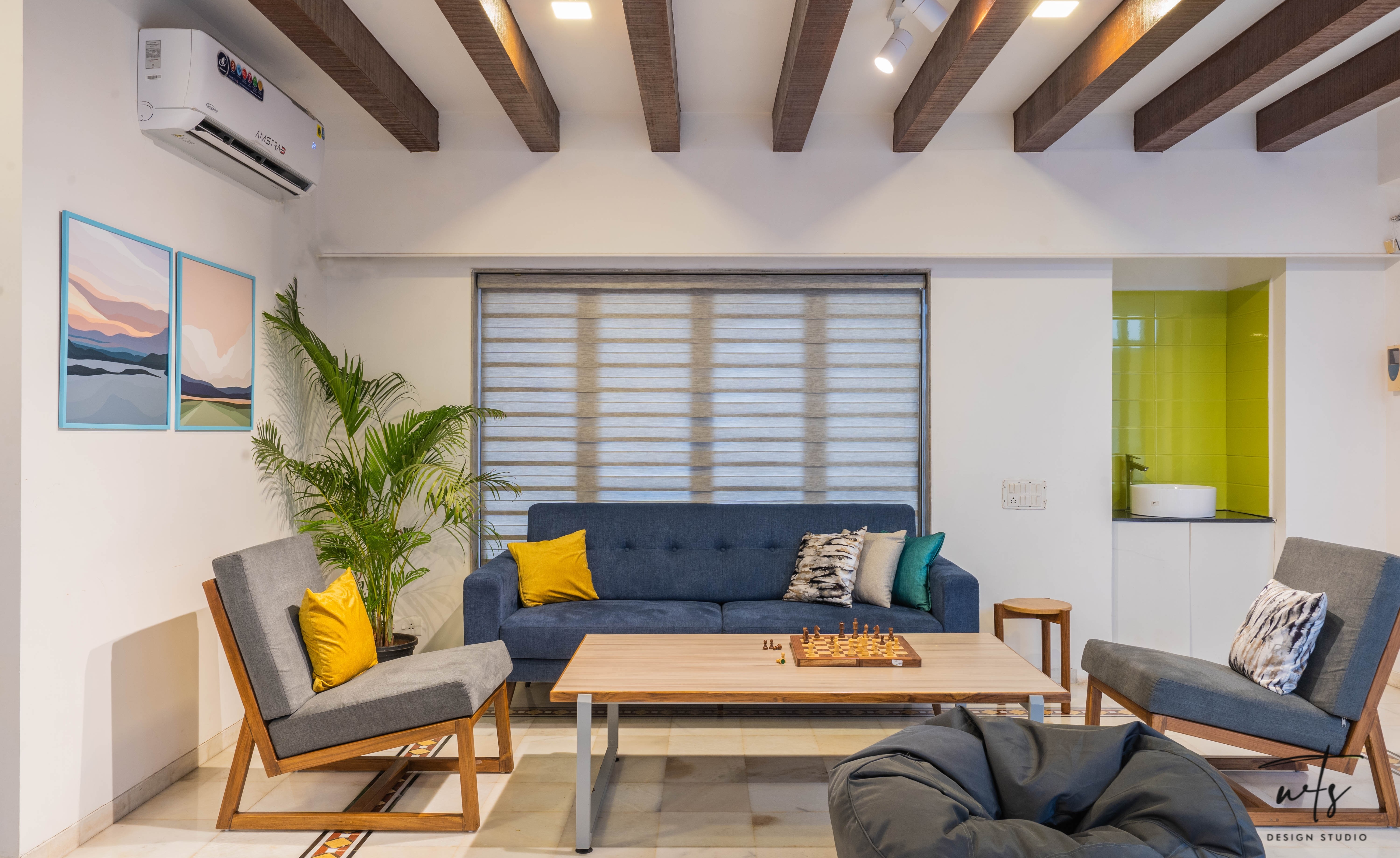Vibrant, bright, and fresh - the BrightCHAMPS office in Miramar was envisioned as a dynamic, youthful workspacethat inspires creativity while supporting modern functionality. Spread across 2,600 sq.ft., the project involved transforming a residential 4BHK apartment on the fourth floor of the iconic Vivenda De Hassan - McDonald's Building into a collaborative, next-gen workplace.