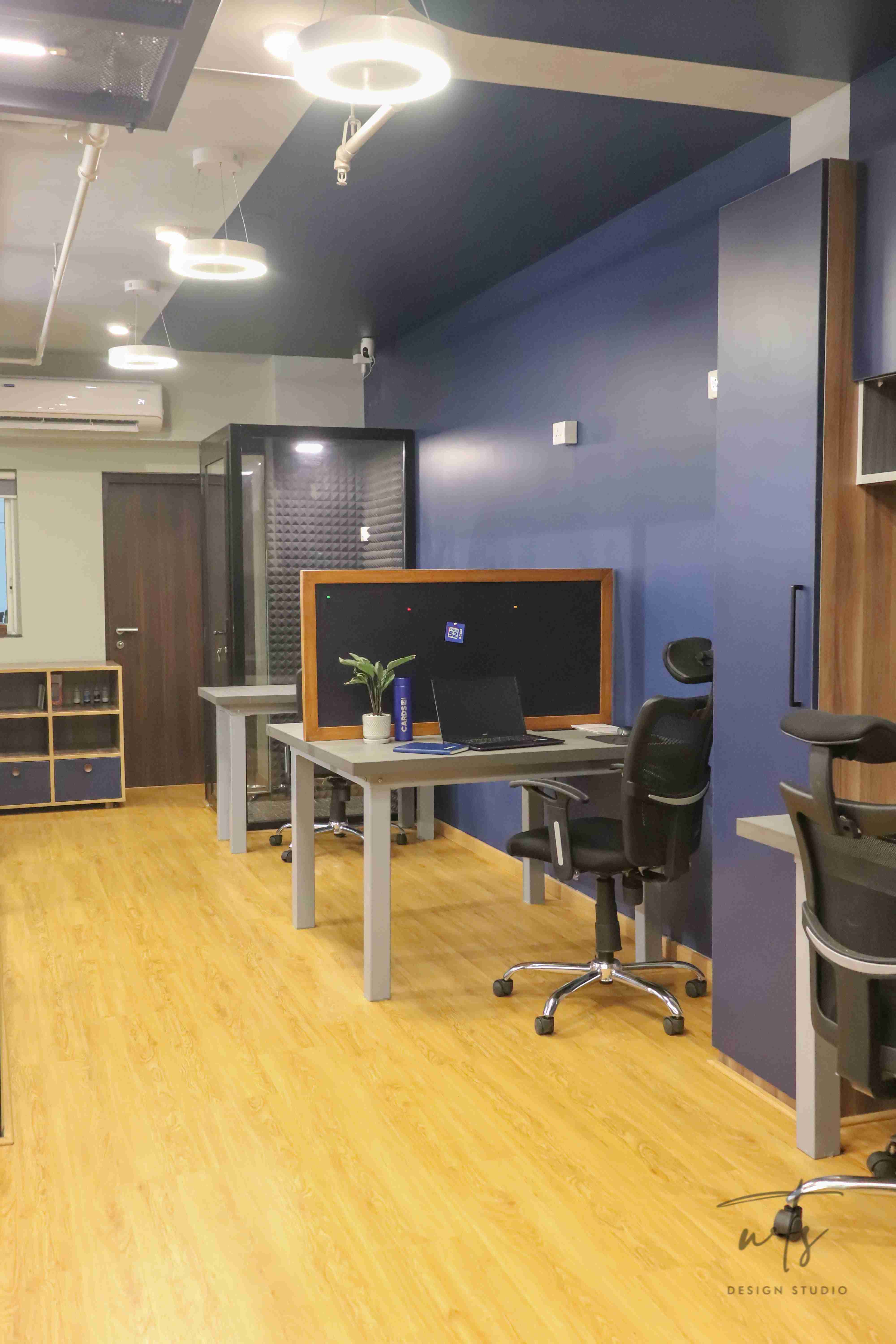 The interiors revolve around a rich blue palette, contrasted with warm wooden flooring and veneered geometric paneling on the main cabin wall. This combination grounds the space in sophistication while bringing a youthful energy. The design balances openness with privacy, ensuring teams can work collaboratively without losing focus