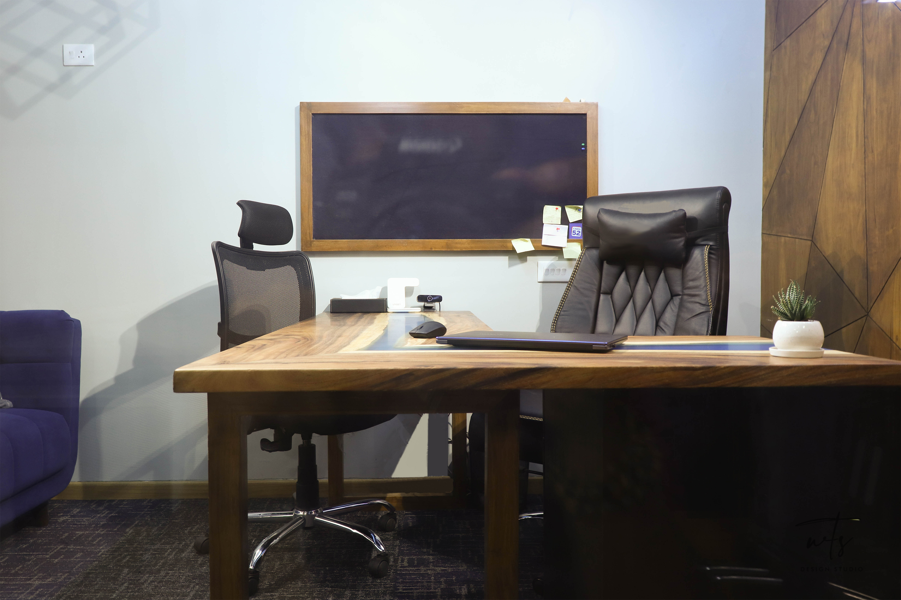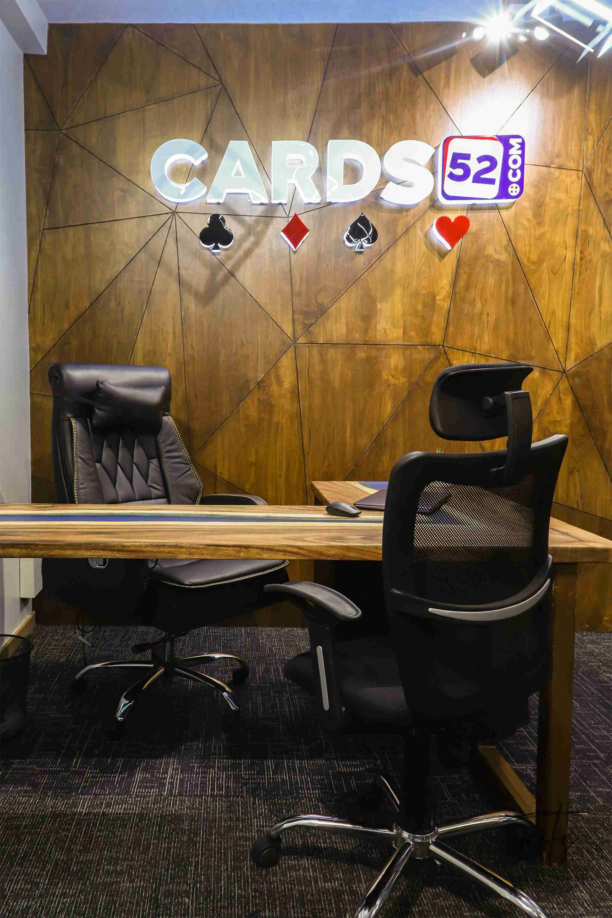 The highlight of the office is the feature wall in the main cabin, clad in veneer with bold geometric cuts and backlit brand signage. It serves as both a backdrop for leadership discussions and a visual anchor for the entire office. The custom epoxy resin desk, with its fluid textures and natural wood grain, adds a contemporary yet artisanal touch - a perfect metaphor for blending creativity with structure.