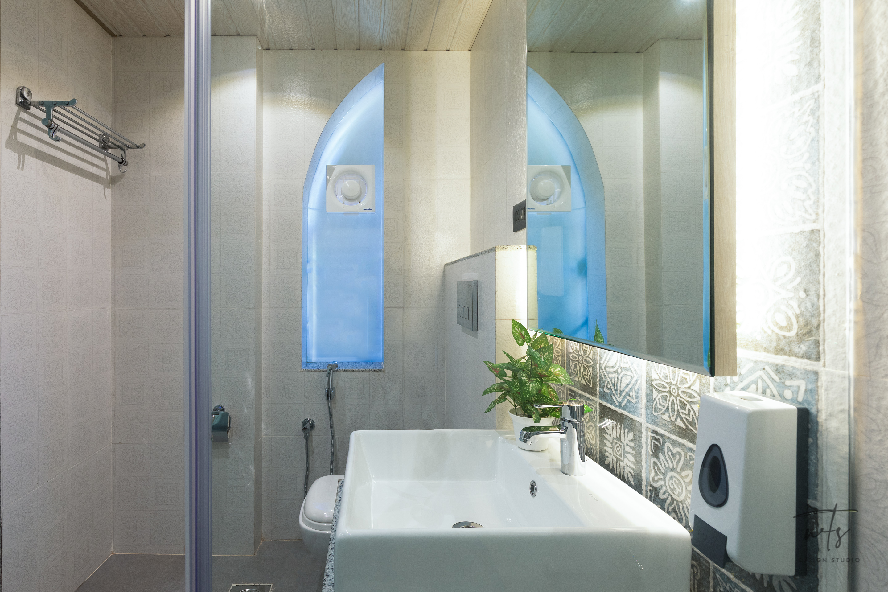 A refined palette of soft greys, natural woods, and patterned tiles forms the visual foundation of the space. The custom “Susegado” light, handcrafted in collaboration with The HÁZO Store, captures Goa's easy-going spirit and adds warmth to the clean geometry. The flooring combines traditional motif tiles with smooth grey finishes, balancing nostalgia and simplicity. An abstract artwork by a local artist, a poster bed, and a large mirror layer the room with depth and craftsmanship, while track lighting highlights textures and form