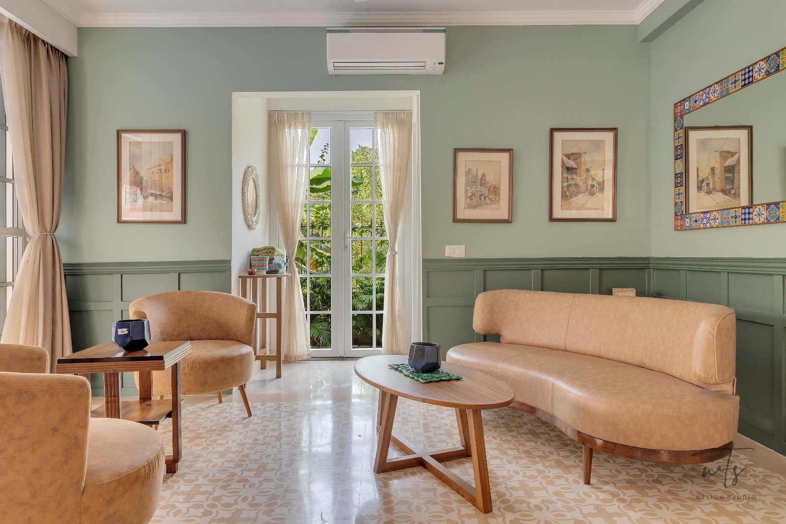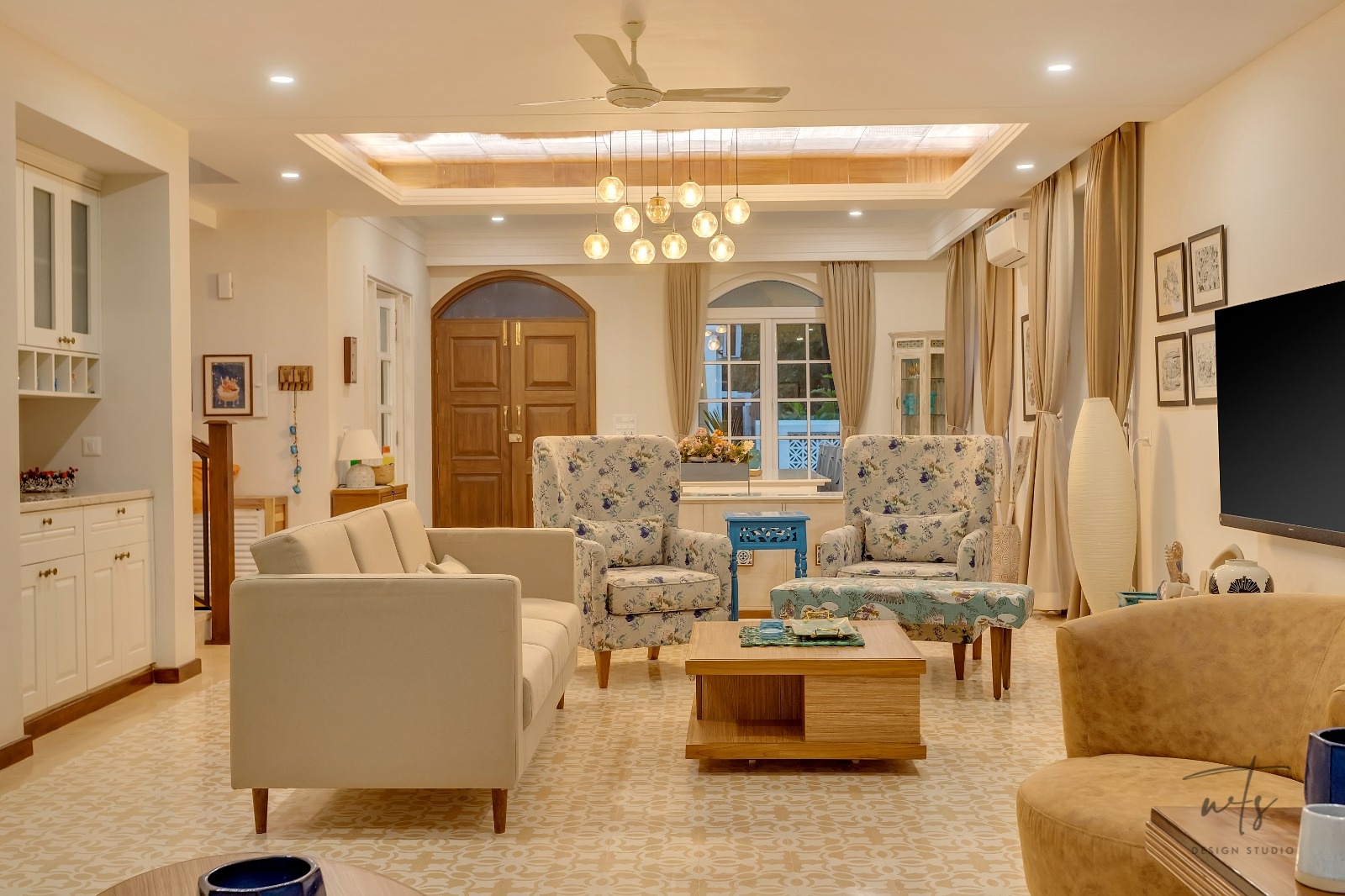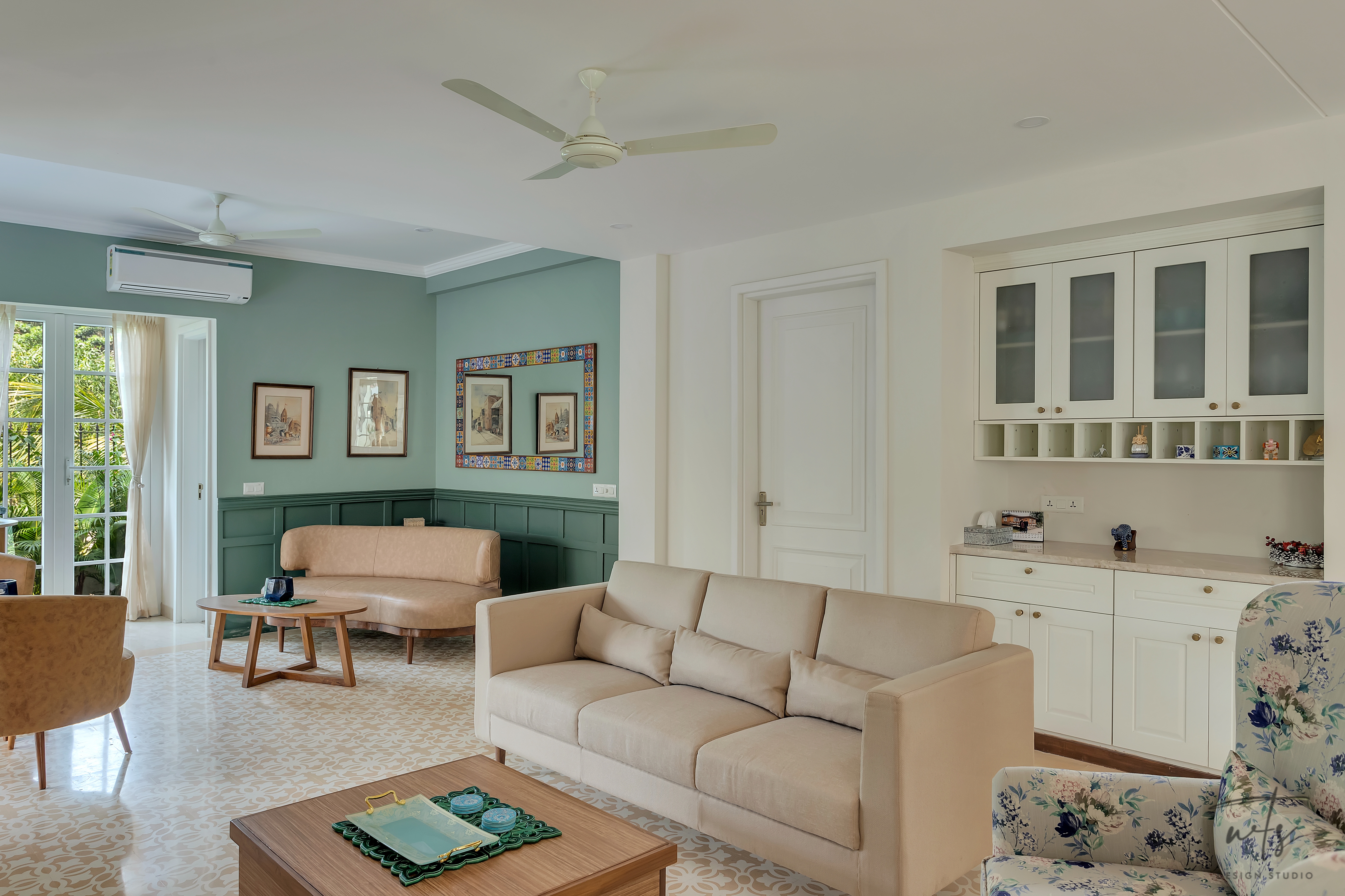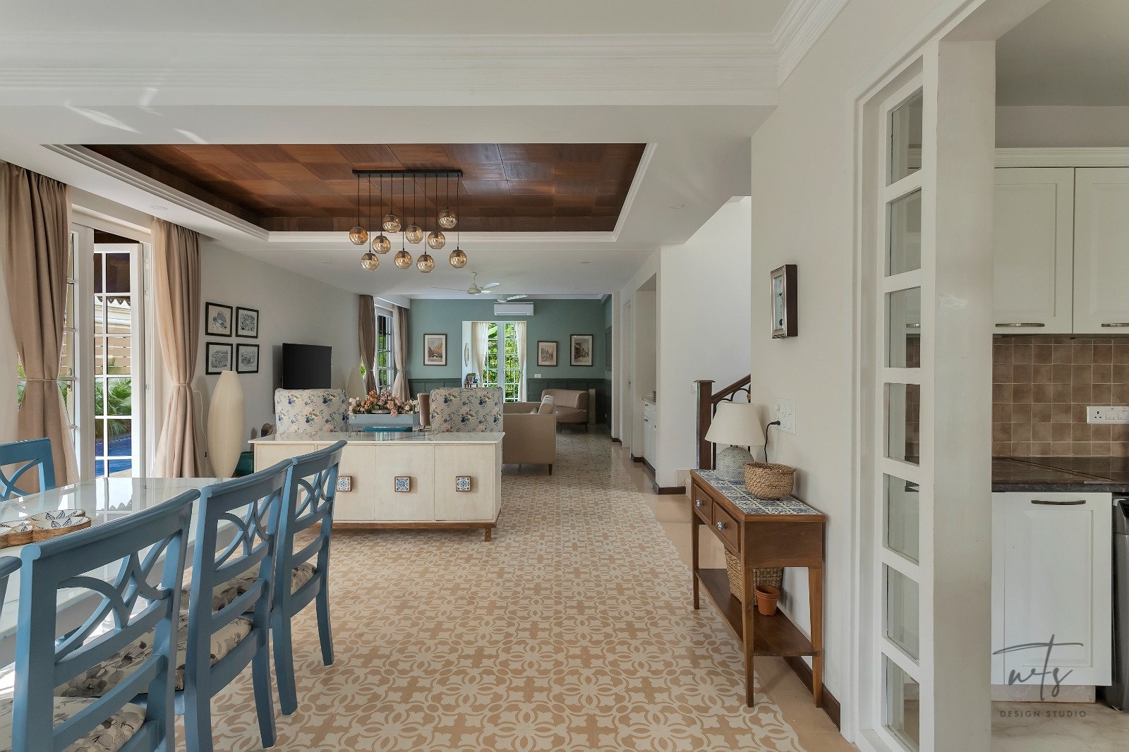 A teal and sage-green palette weaves freshness through the common areas, paired with patterned cement tiles that ground the design in tradition. The wooden ceiling grid with hanging glass globes adds subtle grandeur, balancing the soft tones below.